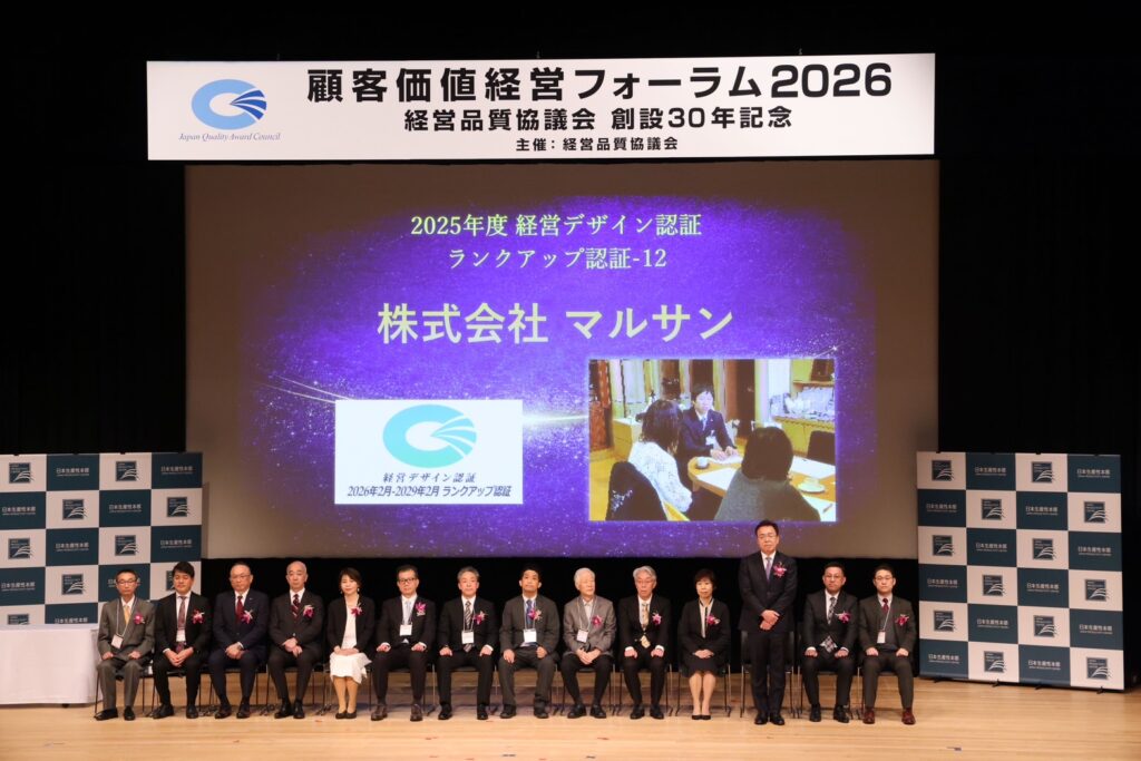 2026年3月5日・6日、経営品質協議会が主催する「顧客価値経営フォーラム2026」に参加いたしました。このフォーラムの場で、マルサン(株式会社マルサングループ)は「経営デザイン認証(ランクアップ認証)」の認証状を授与されました。葬祭業としては全国で初めての取得となります。栃木県経営品質協議会をはじめ、多くの皆さまにご支援いただいたことに心から感謝申し上げます。