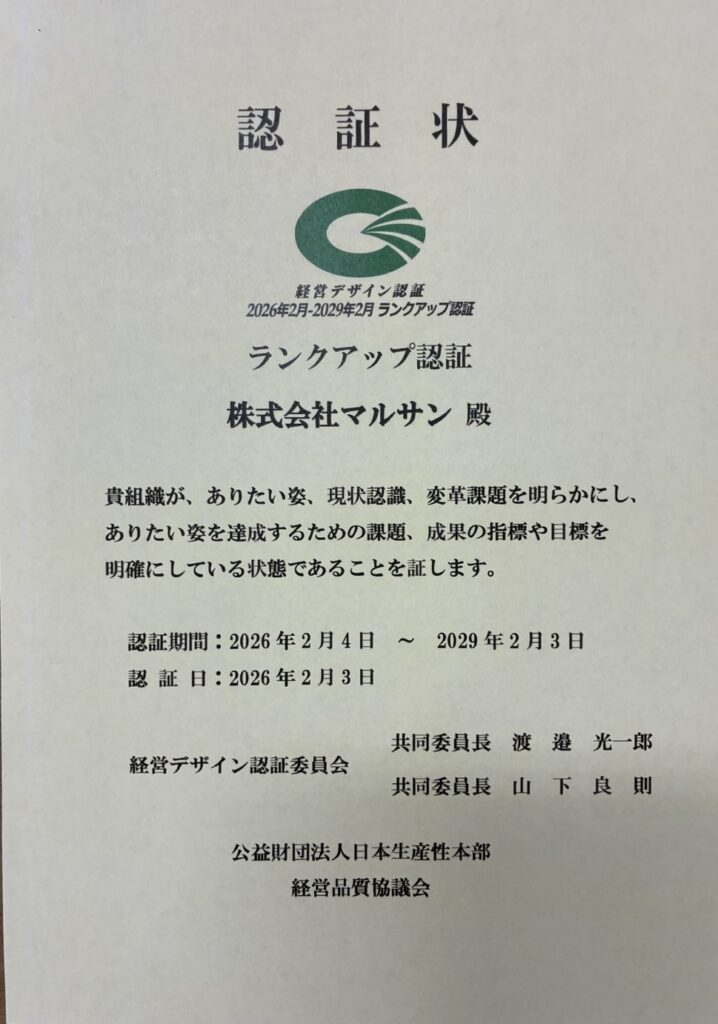 経営デザイン認証の取り組みを通じて、サービスの質を客観的に評価・改善するプロセスを継続してきたことが、今回の認証という形で評価されました。また、事業承継や次世代への経営の引き継ぎを見据えた「経営の見える化」という観点でも、この認証制度への取り組みは大きな意義を持つものと考えています。